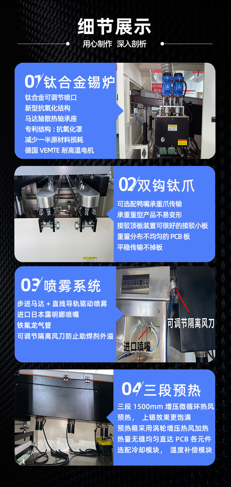 ◇焊錫爐采用鈦合金材料制作。特制鈦合金爪并陽極氧化加硬處理,使用壽命長。