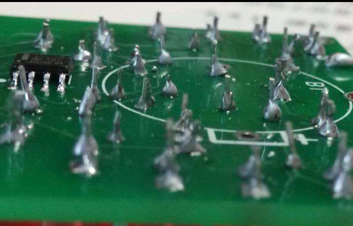 拉尖大多發(fā)生在PCB銅箔電路的終端。PCB經(jīng)過波峰時,PCB上的液態(tài)料下墜受到限制時就會出現(xiàn)此現(xiàn)象。在高頻、高壓電路中,尤其需要注意此類缺陷的危害。