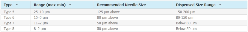 u 針頭內徑至少是焊料顆粒大小的五倍才能有效避免出現堵塞問題。常見的錫膏顆粒大小和針頭大小關系如下: